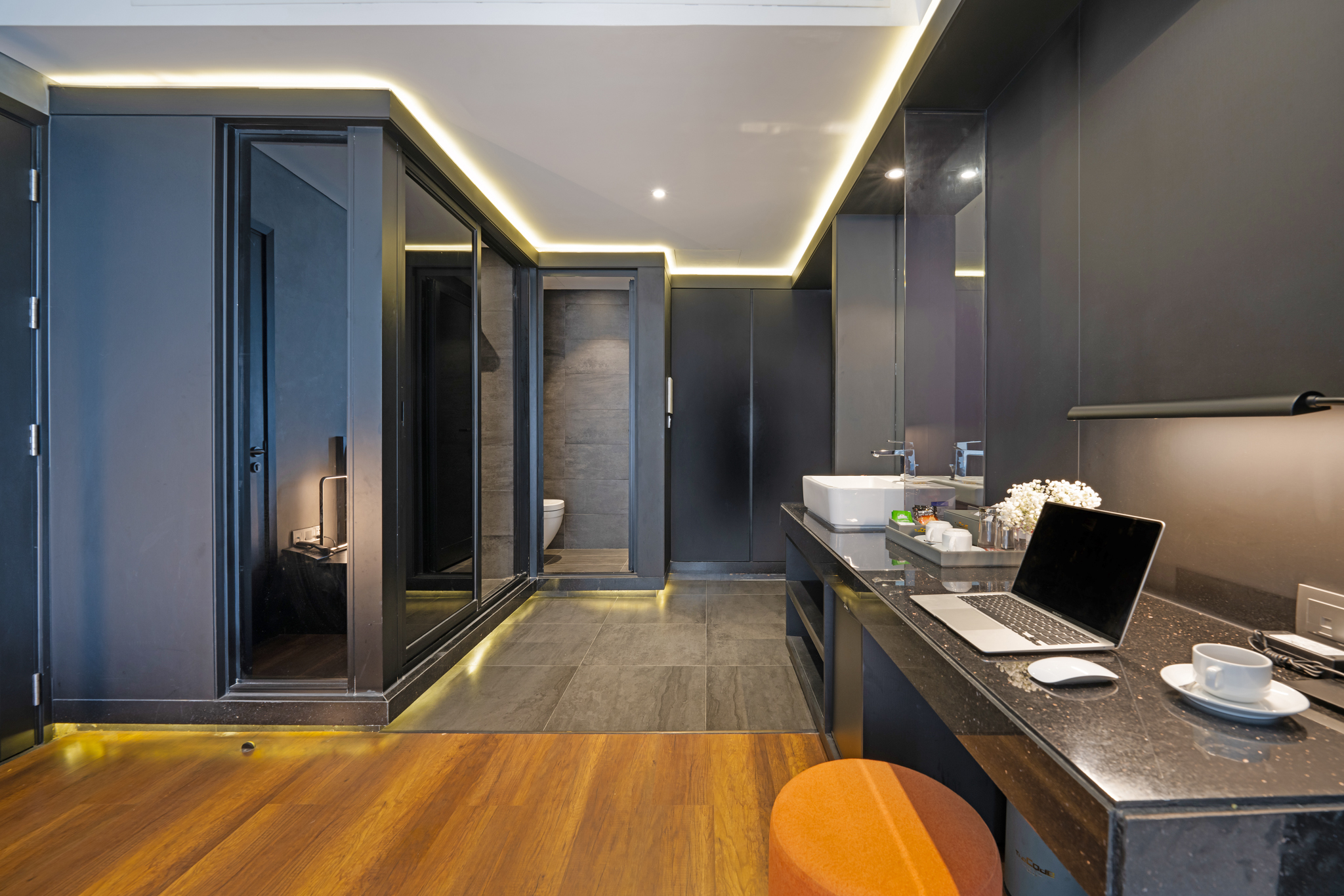 A modern and sophisticated combination inspired by natural light crept through the tiny boutique doorway, along with a combination of bathtub on the balcony to create a floating feeling between endless nature through it arousing inspiration and reinventing energy after busy days with daily life.